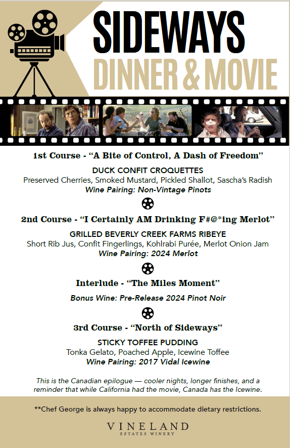 It’s a great night out in February to enjoy a fine meal inspired by a famous wine-themed movie, plus have a few laughs. Whether you know every quote or have never seen it, this witty, heartfelt cult classic is pure wine-country joy—best enjoyed with great food & wine and even better company.